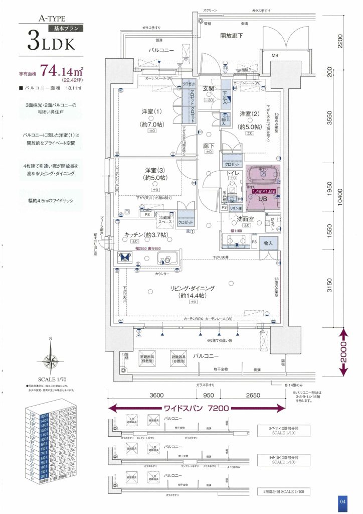 3LDK 74.14平米(22.42坪) 角部屋 バルコニー 18.11㎡